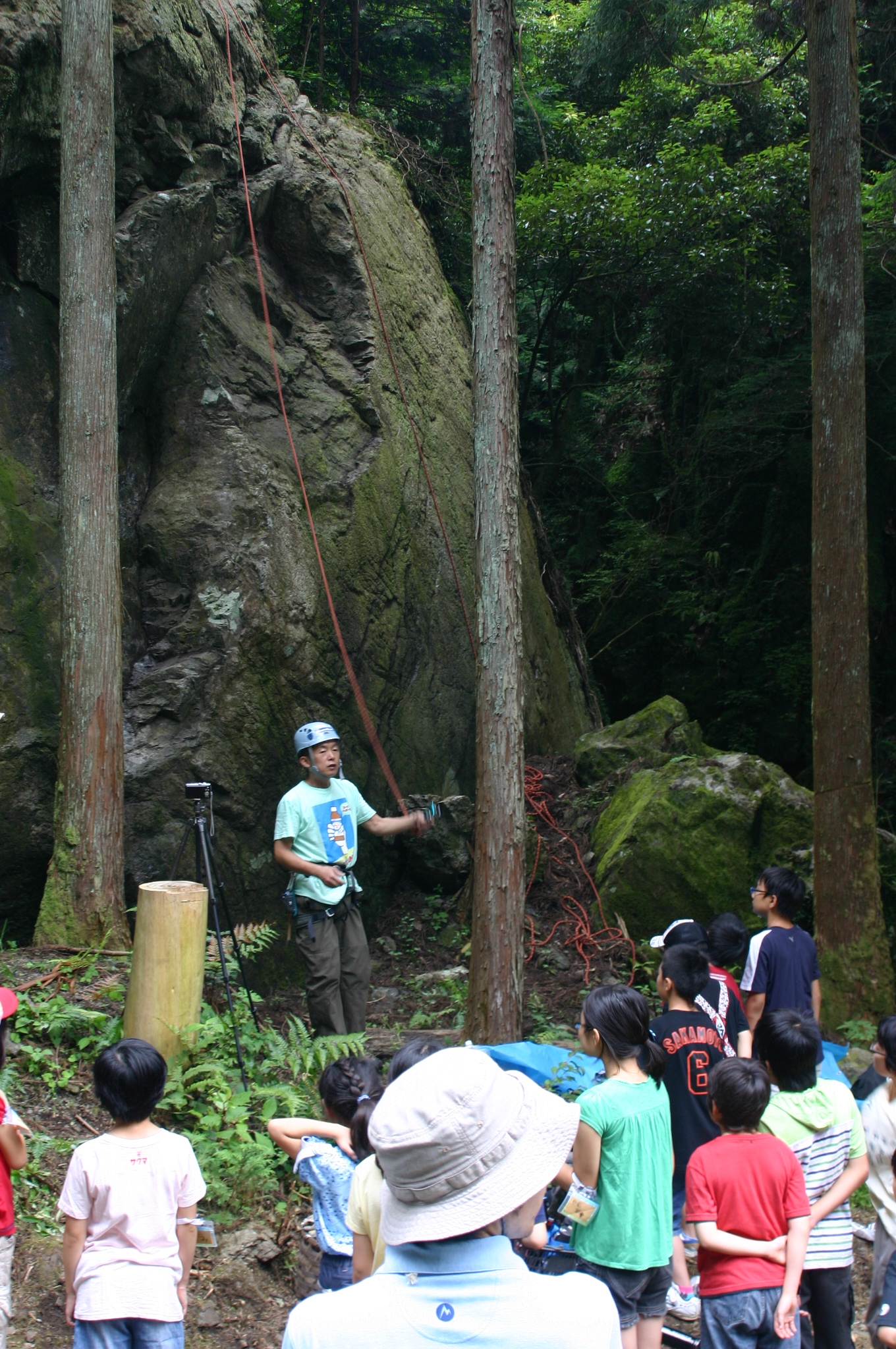 午前中は、森の入り口にある大岩でフリークライミングに挑戦しました。
